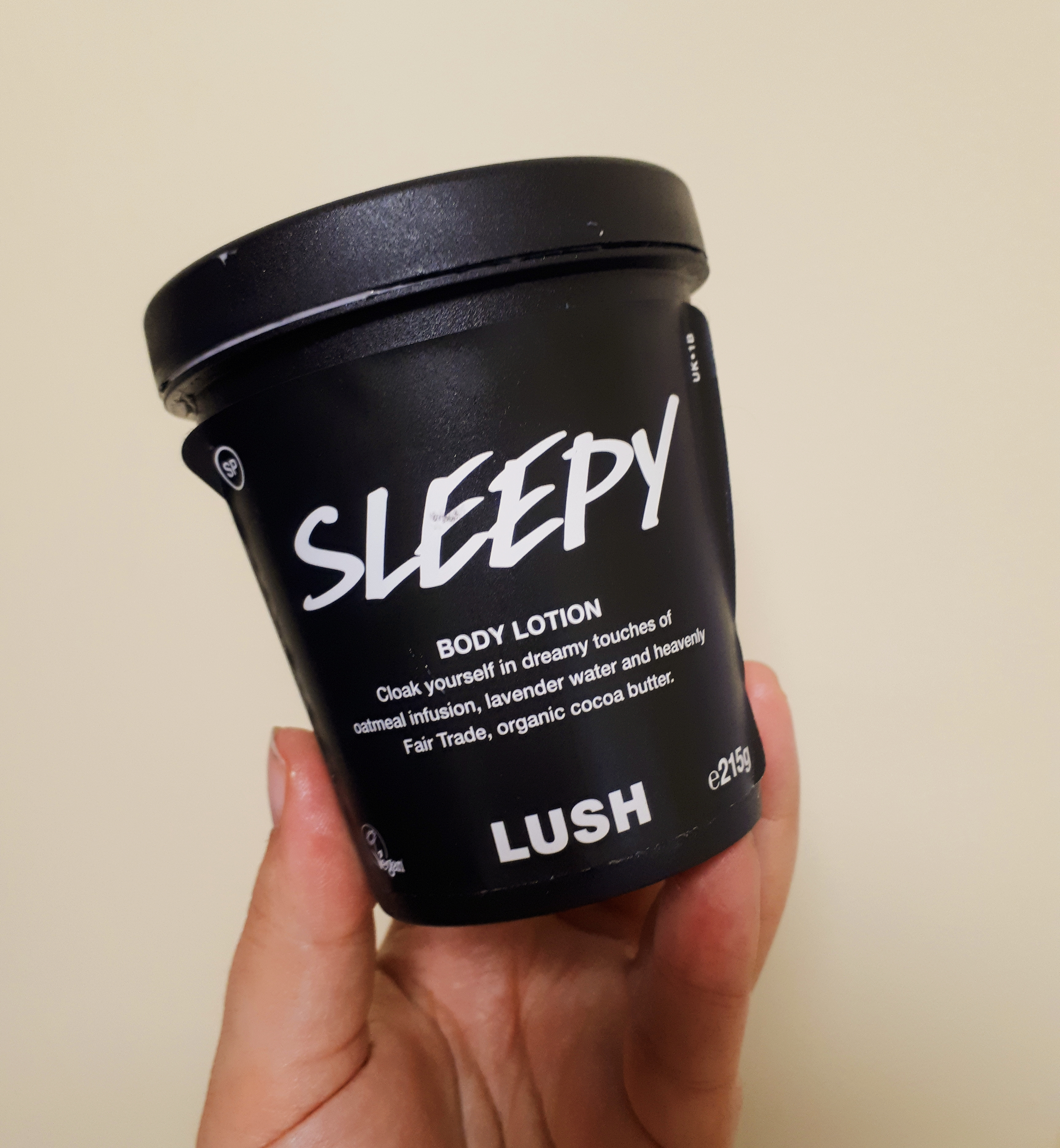 Rosie's hand holding a black pot of Lush's Sleepy