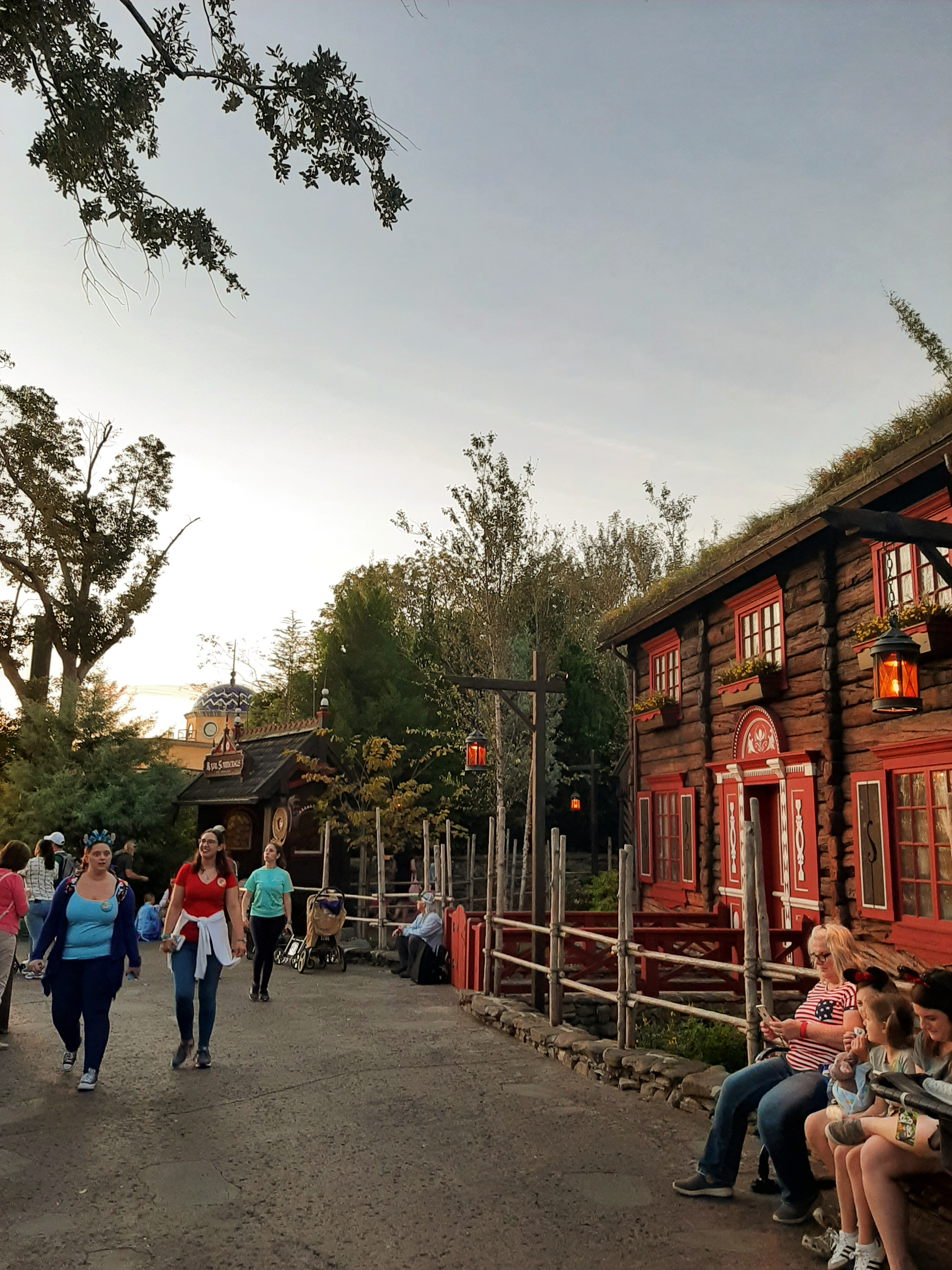 Brown log house and crowds in Norway at EPCOT's World Showcase