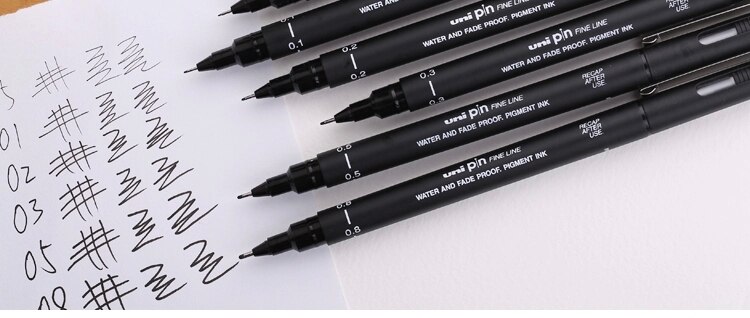 You can use any pencil case, pencils, and rubber, and the choice of actual bullet journal is a personal one; I’m currently using a Leuchturm 1917 and have a soft spot for the Rhodia Webnote books. But the pens you use make all the difference. The pens I use for writing and drawing are the Uni Pin Fine Line. I got these pens as a pack of ten for around ten pounds in a sale in Ryman (a steal, I tell you). Why do I love these so much? Firstly, they come in a range of sizes! Starting at an extremely thin 0.05cm tip, great for sketching, and ending at a 0.8cm tip, great for outlines, they offer you an immense amount of choice and intricacy.